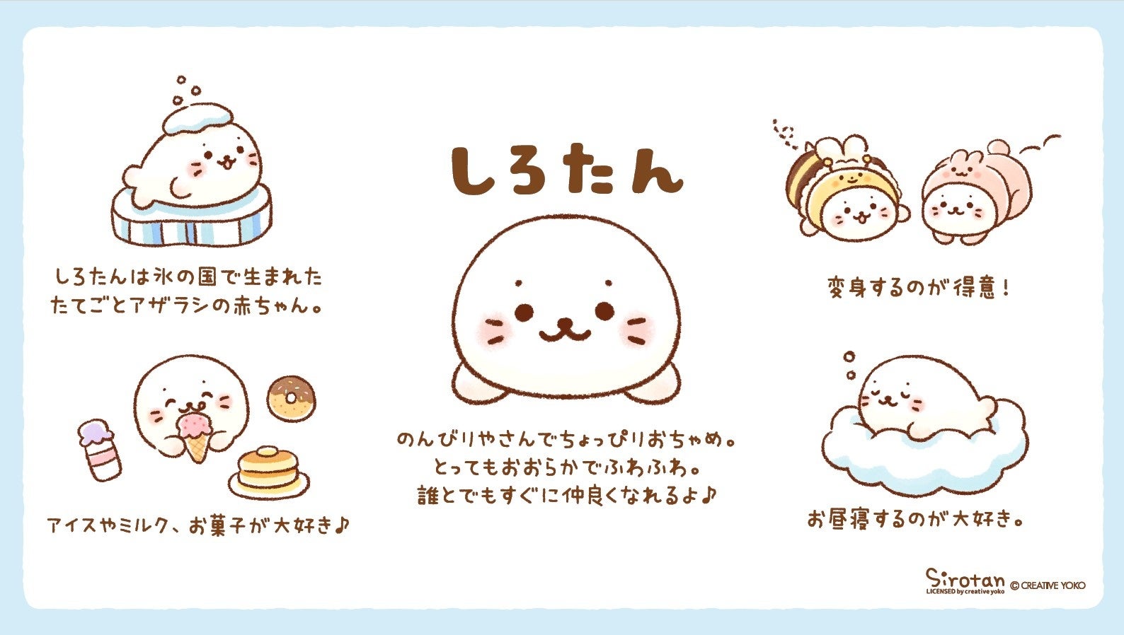 「しろたん」は1999年に誕生した今年26周年を迎える株式会社クリエイティブヨーコのオリジナルキャラクターです。たてごとアザラシの赤ちゃんをモデルにした愛らしい姿が長きに渡ってファンを癒し魅了しています。