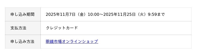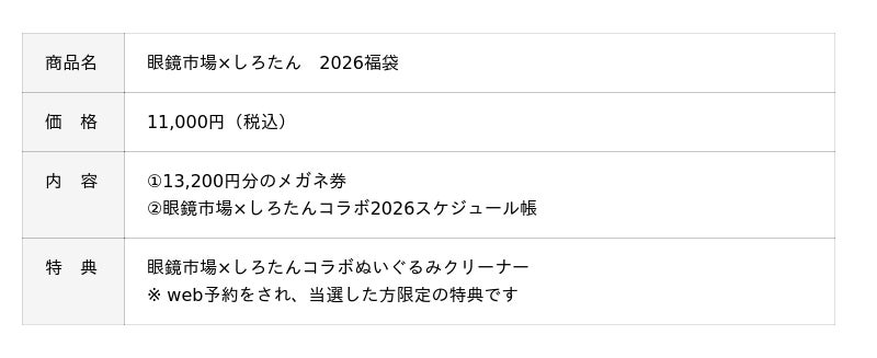 株式会社メガネトップ(本社:静岡市葵区、代表取締役社長:冨澤昌宏、以下「眼鏡市場」)は、「眼鏡市場×しろたん 2026福袋」の抽選販売を2025年11月7日(金)より、眼鏡市場×しろたん2026福袋特設サイト(https://www.meganeichiba.jp/lp/fukubukuro2026/)にて開始します。