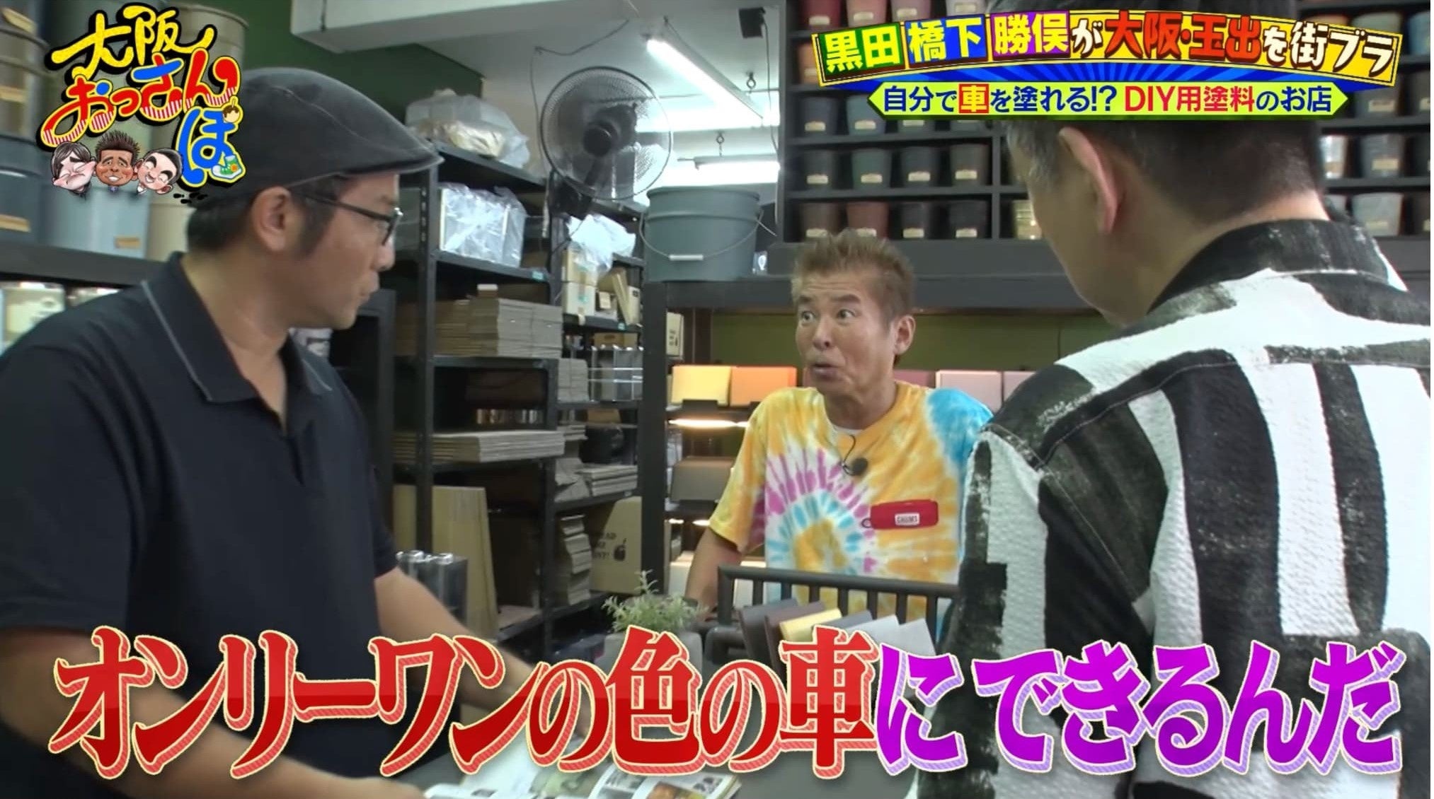 大通り沿いを歩いていると、おしゃれな外観に惹かれて立ち寄ることにした3人。ここは1948年から続く「タカラ塗料」という塗料販売店。なかでも、誰でも簡単に車を自分でDIYペイントできる塗料と道具のセットが人気だそう。
