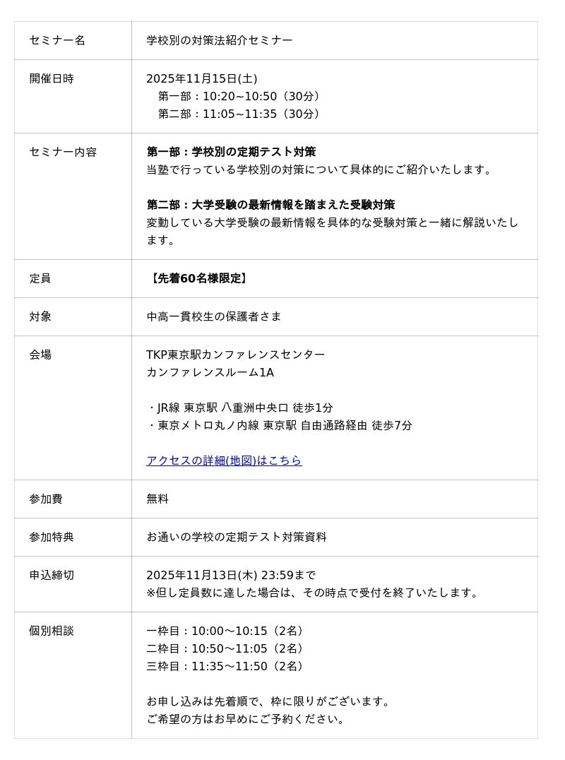 中高一貫校生に向けた「学校別の対策法紹介セミナー」を11月15日(土)に東京で開催