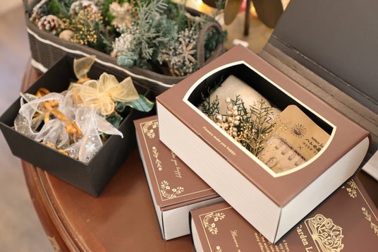 ショップでは絵本の販売のほか、クリスマス雑貨を扱っています。また、オリジナル本型ボックスに刺繍ロゴハンカチ、ミニメモ、ハーブティー、ミニブーケをセットにしたギフトボックスを販売しています。絵本のほか、お買い物をお楽しみいただけます。