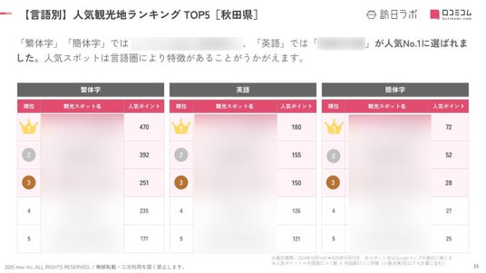 - 調査対象:訪日ラボが独自に選出した秋田県の観光スポット(計1,201箇所)