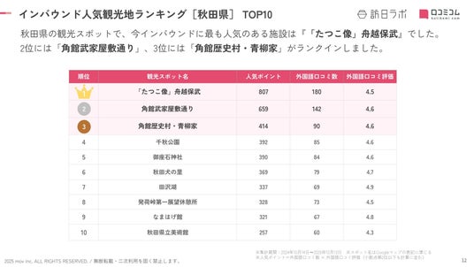 業界最大級のインバウンドビジネスメディア「訪日ラボ」及び 店舗向け集客一元化プラットフォーム「口コミコム」を運営する株式会社mov(代表取締役:渡邊 誠、本社:東京都渋谷区、以下mov)は、秋田県の観光地に寄せられた最新の口コミデータから、独自の『インバウンド人気観光地ランキング』を発表しました。