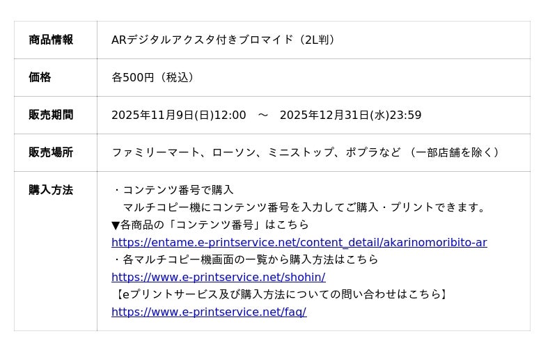 各社コンビニのマルチコピー機で引換コード付きのブロマイドを購入することで、ARデジタルアクスタが1体ダウンロードできます。