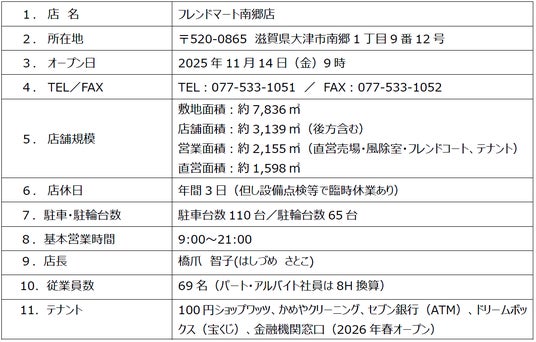株式会社平和堂(滋賀県彦根市、代表取締役社長執行役員CEO:平松正嗣、以下「平和堂」)は、2025年11月14日(金)あさ9時、滋賀県大津市にフレンドマート南郷店(以下「当店」)をオープンしますのでお知らせします。当店のオープンにより滋賀県内は83店舗、平和堂は全168店舗となります。