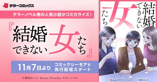 株式会社テラーノベル(本社:東京都港区、代表取締役社長:蜂谷宣人)は、株式会社トーハン(本社:東京都新宿区、代表取締役社長:川上浩明)と共同設立したコミックレーベル「テラーコミックス」にて、テラーノベル発の人気小説『結婚できない女たち』をコミカライズし、コミックシーモアでの先行配信を2025年11月7日より開始することをお知らせいたします。