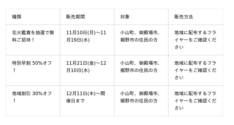 今回の「富士山花火vsスピードウェイ2026」のチケットは、ふるさと納税での早期受付、早割チケット、近隣在住の方を対象にした無料抽選や地域割引など、時期やエリアに合わせた販売を順次スタートします。
