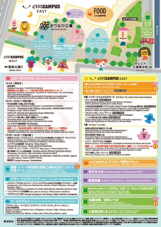 スタンプラリーも実施します。1.日本語スピーチコンテスト会場2.地震体験/消防広場3.豊橋・トリード姉妹都市25周年特別展示―の3カ所でスタンプを集めると、先着300人に景品をプレゼント。スタンプカードは本部で配布します。