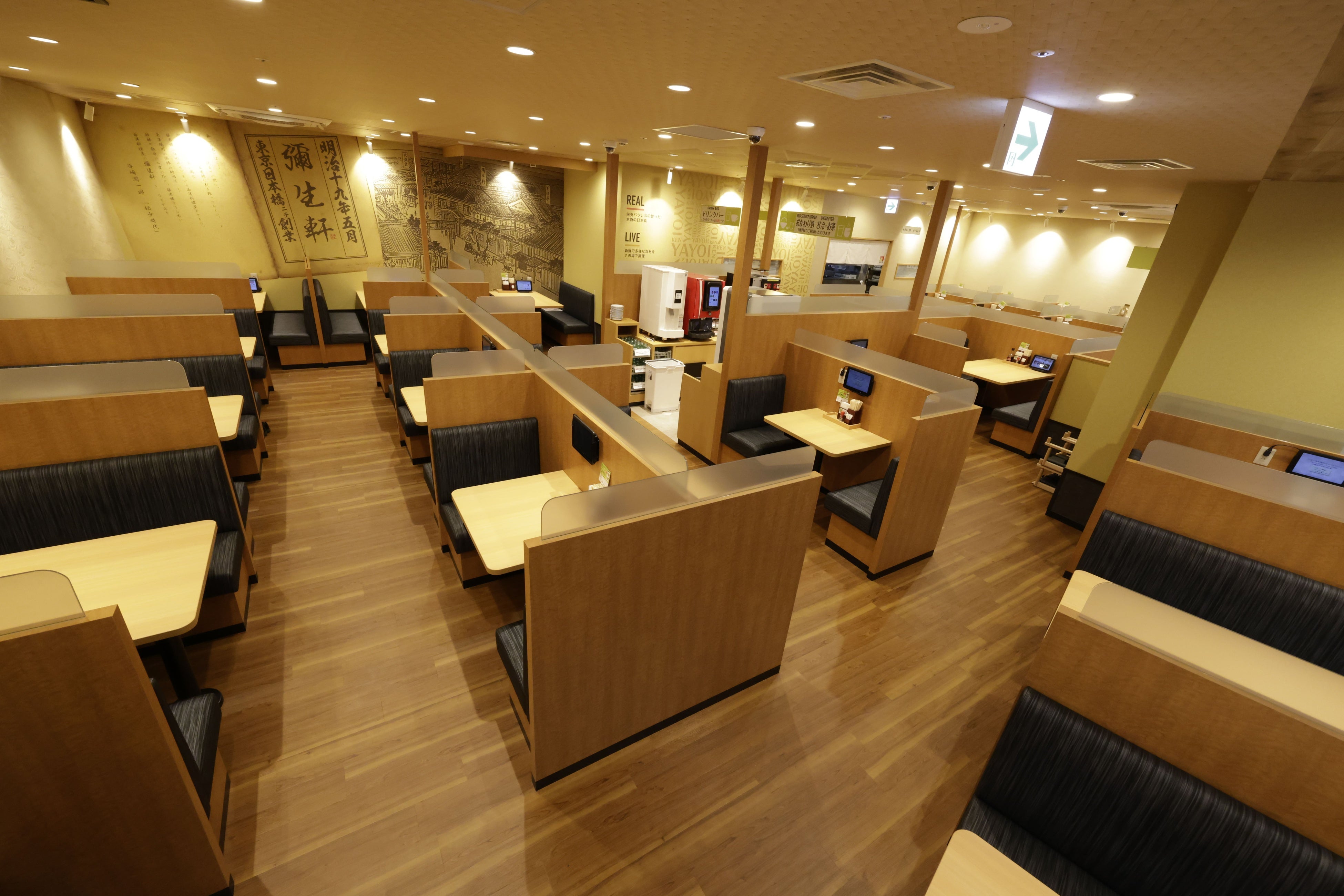 当店舗は2023年12月に公開しましたロゴ・シンボルマークなど新しいブランドイメージを表現した店舗となっております。ロゴ看板、モダンな“和”をイメージさせる暖簾(のれん)や「やよい軒」の名前のルーツでもある“彌生軒(やよい軒)”の歴史的資料をモチーフとした壁紙など、ブランドステートメントを表現する“上質な”イメージでデザインされた店舗です。また、ゆっくりとメニューを選んでいただけるようテーブルに設置したタブレット端末からのオーダーや店舗限定デザートメニューの導入、さらにドリンクバーを設置することでくつろぎの時間を過ごしていただけるようにしました。 もちろん、“ごはん”や“だし”、“漬け物”のおかわり自由が楽しめる『おかわり処』もございます。