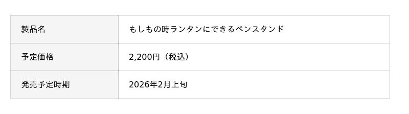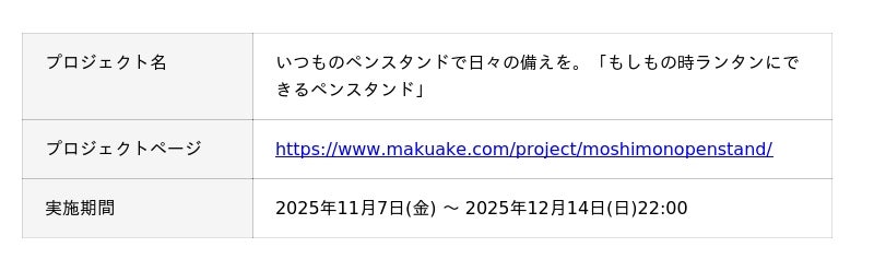 プラス株式会社(東京都港区 代表取締役社長 今泉忠久)は、「もしもの時ランタンにできるペンスタンド」の市場導入にあたり、株式会社マクアケ(本社:東京都渋谷区、代表取締役社長:中山亮太郎)が運営するクラウドファンディングサービス「Makuake」を利用したプロジェクトを、2025年11月7日(金)より開始しました。