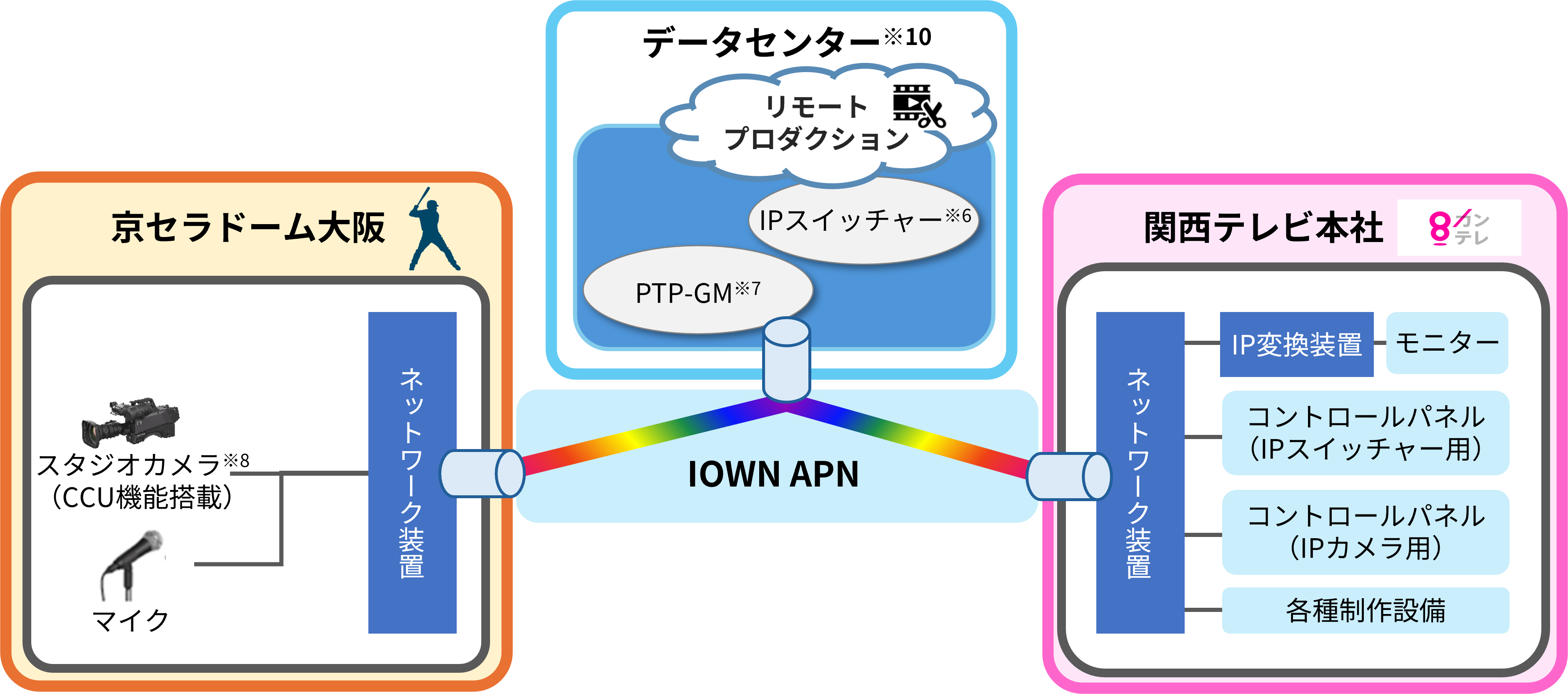 NTT西日本グループ※1は、関西テレビ放送株式会社(以下、関西テレビ)と共同で、2025年9月6日に京セラドーム大阪で開催されたプロ野球公式戦「オリックス・バファローズ 対 北海道日本ハムファイターズ」の地上波放送向け中継において、IOWNオールフォトニクス・ネットワーク(以下、「IOWN APN」)※2※3を活用し、データセンター集約型の制作設備を遠隔操作するリモートプロダクション※4環境を構築・運用しました。