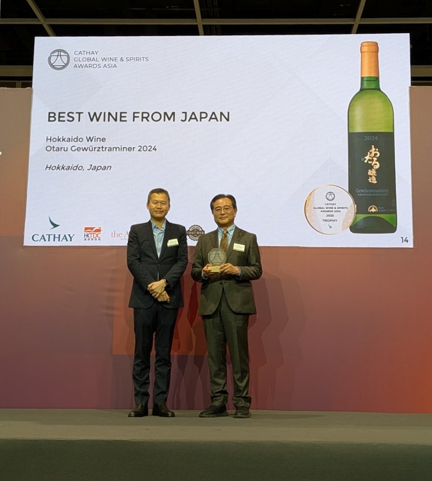 北海道ワイン株式会社(本社:北海道小樽市、以下当社)は、2025年11月6日(木)に香港で発表された国際ワインコンペティション「GLOBAL WINE & SPIRITS AWARDS ASIA 2025(GWSAA2025)」において、自社製造の白ワイン『おたる ゲヴュルツトラミネール 2024』が金賞を受賞し、さらに出品された日本産ワインの中で最高評価を得たワインに授与される「Best Wine From Japan」トロフィーを獲得したことをお知らせいたします。