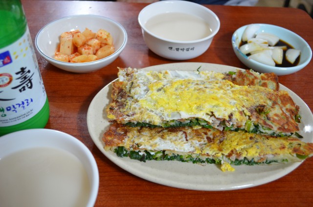 韓国ではジョン(チヂミ)には生マッコリと相場が決まっている。