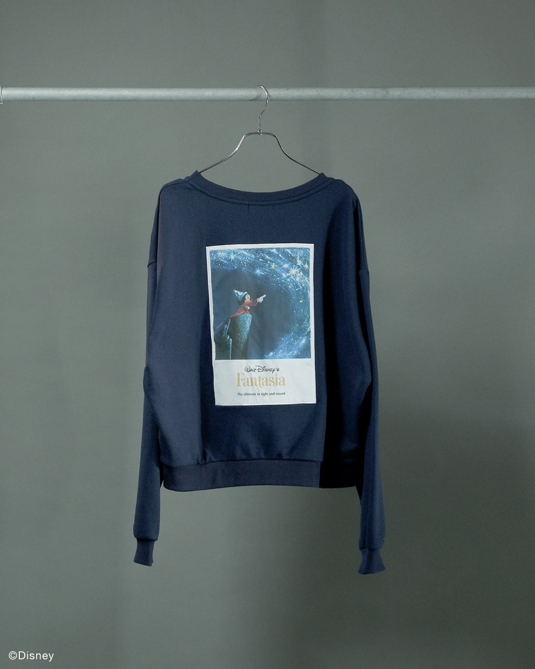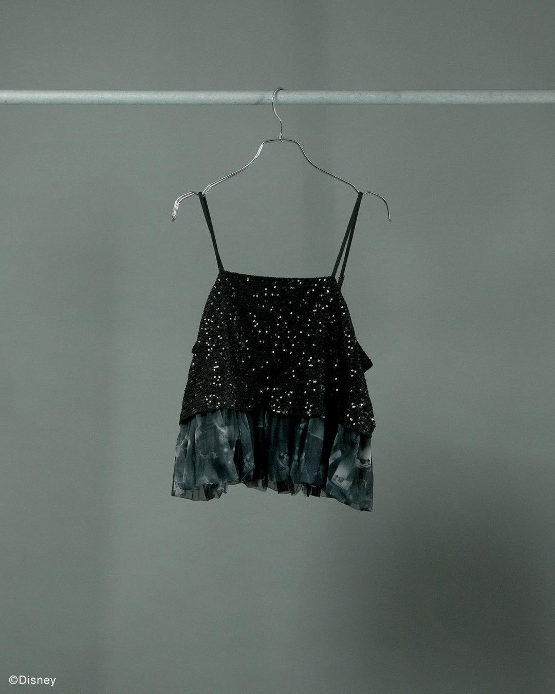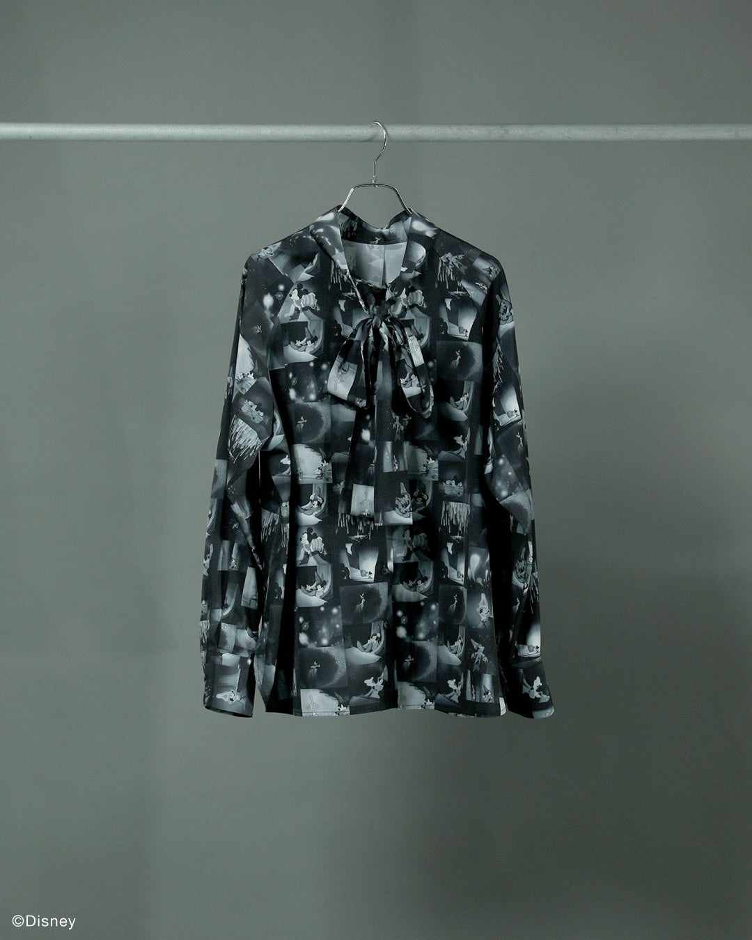 名場面を総柄に落とし込んだボウタイブラウスは、モノクロでシックな印象に仕上げました。ボウタイ部分にさりげなく入れたFANTASIAのロゴもポイントです。また、キラキラと輝くスパンコールビスチェにも、ボウタイブラウスと同じ総柄プリントをチュールに施しました。
