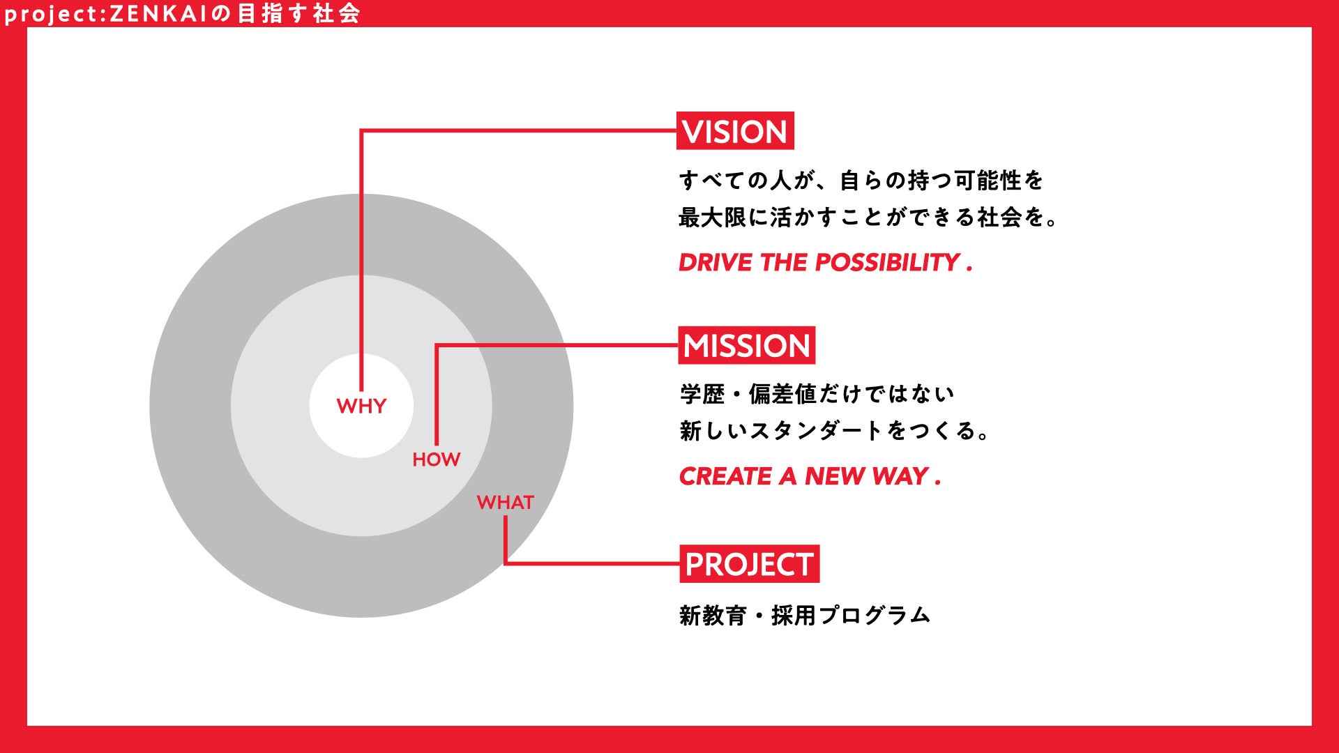 project:ZENKAI(以下、ZENKAI)は、「すべての人が、自らのもつ可能性を最大限に活かすことができる社会を実現する」をビジョンに掲げ、従来の教育・採用活動が指標としてきた“学歴や偏差値”といったひとつの物差しではなく、一人ひとりが持っている可能性に焦点をあて、対話と実践を通じて、「お互いの可能性を信じて、応援し合える」仲間づくりを行っているプロジェクトです。