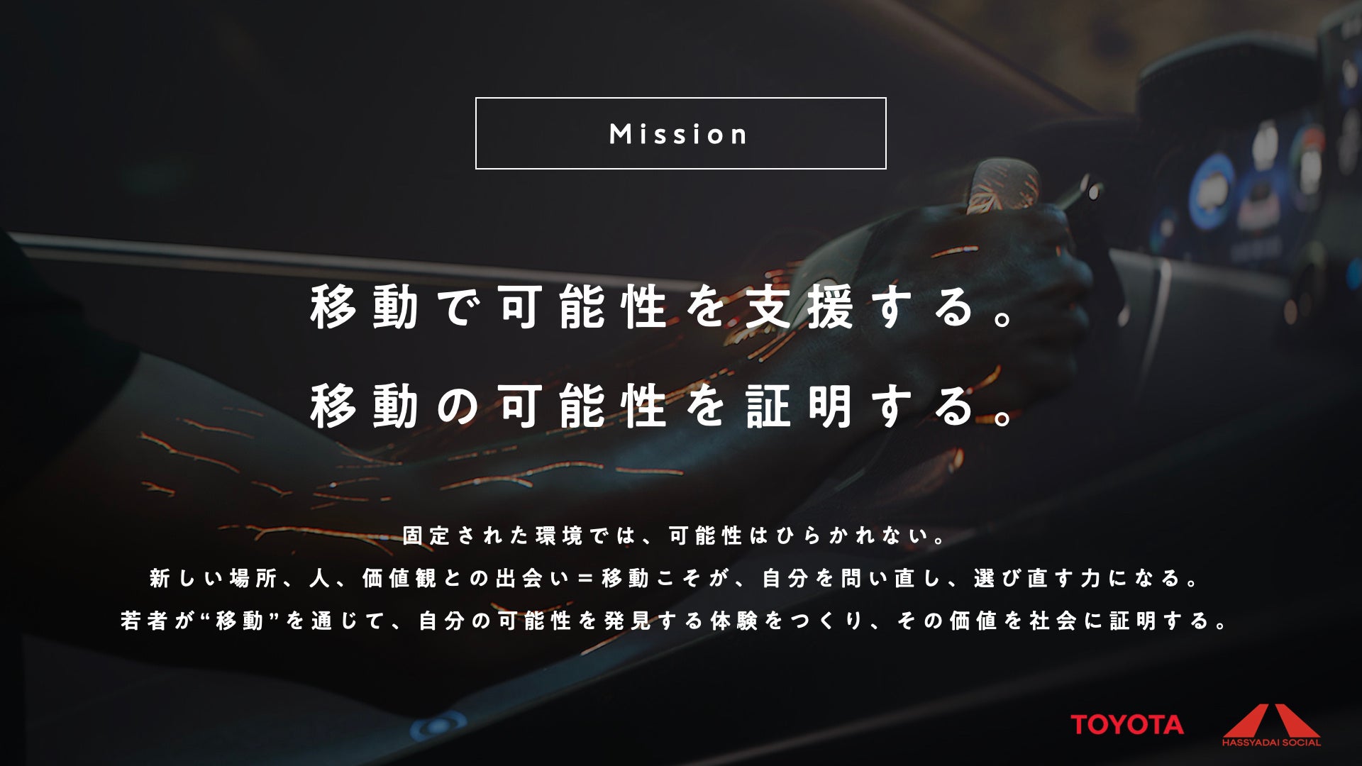 トヨタ自動車とハッシャダイソーシャルは、これまでもそれぞれの活動を通じて“移動”が人生にもたらす可能性に向き合ってきました。