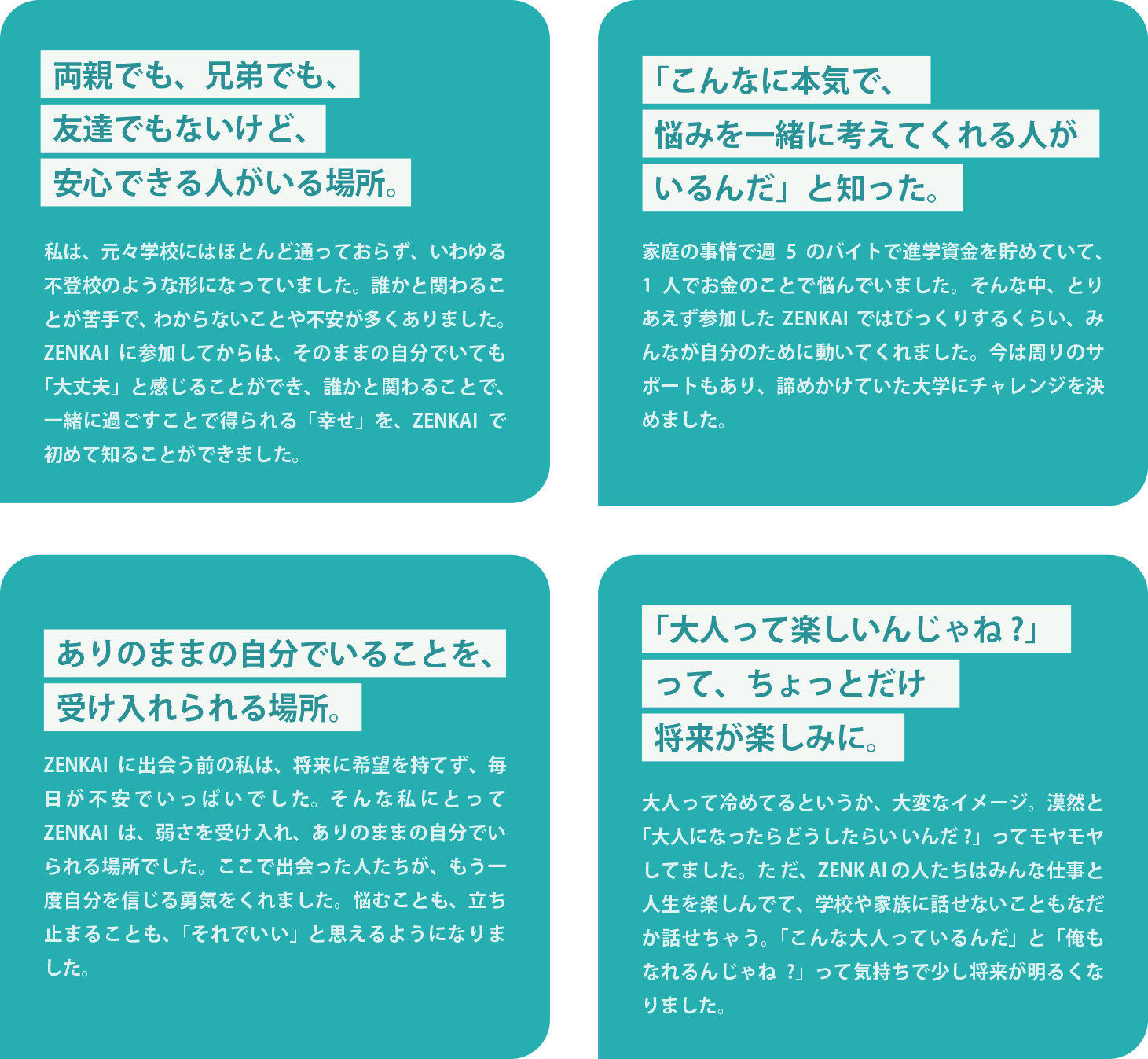 これから先もメンバーが「人生を語り直す」場として、そしてそれを糧に、「自分の可能性を信じて活かすことができる」ように、ZENKAIは仲間との出会いと対話を続けていきます。