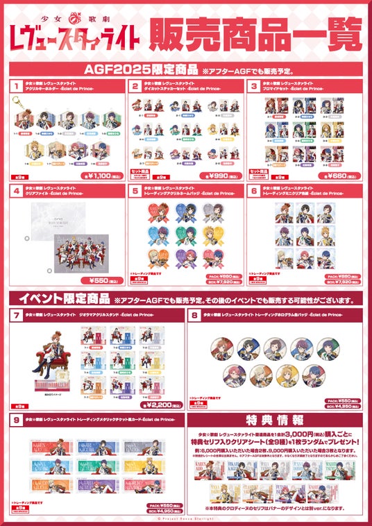 株式会社ブシロード(本社:東京都中野区、代表取締役社長:木谷高明)のグループ会社にあたる株式会社ブシロードクリエイティブ(本社:東京都中野区、代表取締役社長:成田耕祐)は、2025年11月8日(土)・11月9日(日)開催のアニメイトガールズフェスティバル2025(AGF2025)にブシロードクリエイティブが出展し、『少女☆歌劇 レヴュースタァライト』の限定商品&先行商品を販売いたします。