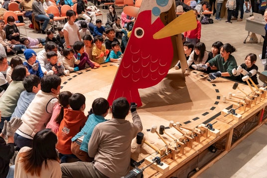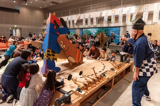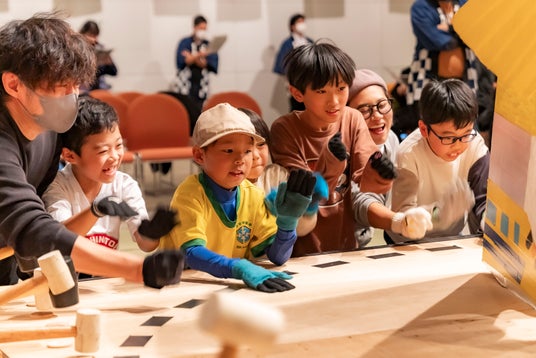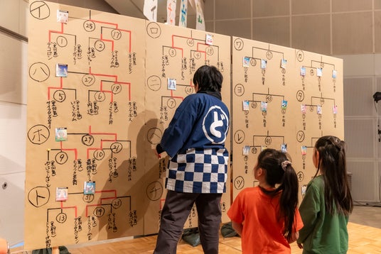「巡業」と称する力士制作ワークショップでは、墨田区内に4つの部屋(東向島・亀沢・東駒形・キラキラ橘)を設けて、子どもたちを中心としたチームで、身長180cm超の巨大ダンボール力士をつくります。それぞれの部屋から8体ずつ、個性豊かな力士が集う「本場所」はトーナメント方式による取組で競い合い、優勝すると横綱の位に輝きます。会場では、制作チームはじめ応援に駆け付けたみんなで土俵を叩きながら対戦を進めるとともに、オリジナルのアプリ「電子どんどこ!」からも好きな力士を応援できます。取組の様子はYouTubeライブで配信し、スマホの画面をタップすると土俵の周りにあるハンマーが動く仕組みで、遠方からもたたき手として参加いただけます。