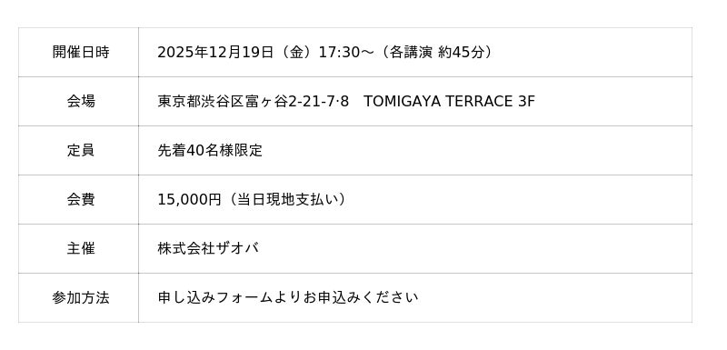 トレーニングマシンブランド「BULL」を展開する株式会社ザオバ(本社:千葉県千葉市中央区、代表取締役:喜多真一)は、特別セミナーを弊社ショールーム「TOMIGAYA TERRACE 3F」にて開催いたします。