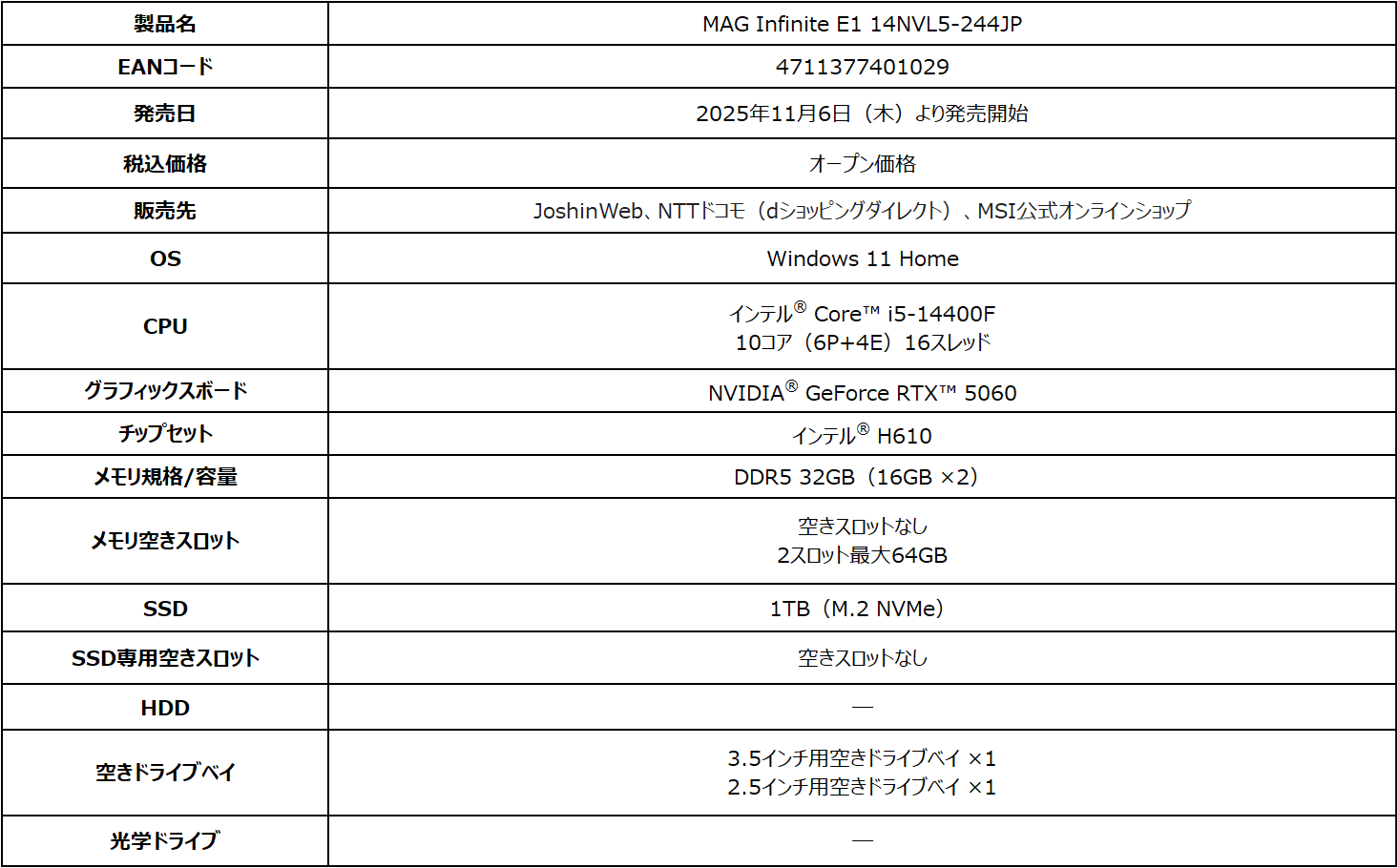 最新のゲーミング体験が得られるDLSS 4マルチフレーム生成に対応したNVIDIA(R) GeForce RTX(TM) 5060を搭載の、より高いフレームレートでのゲーミングを実現し、大容量32GBメモリ、有線LAN・Wi-Fi 6E対応で設置環境を選ばず、コストパフォーマンスにも優れた「MAG Infinite E1 14NVL5-244JP」が新たにラインナップに加わります。