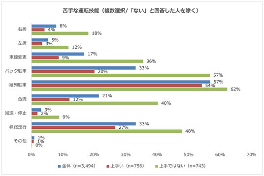 今回のアンケートで、運転が「上手い」と認識している人、「上手ではない」と認識している人ともに、「駐車」は特に苦手意識を持つ技能であることが分かりました。