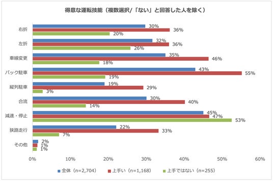 得意な運転技能について尋ねたところ、全体では「減速・停止」が45%と最も多く、次いで「バック駐車」43%、「車線変更」35%となりました。自身の運転を「上手い」と回答した人の得意な運転技能TOP3は、1位「バック駐車」55%、2位「減速・停止」47%、3位「車線変更」46%という結果でした。