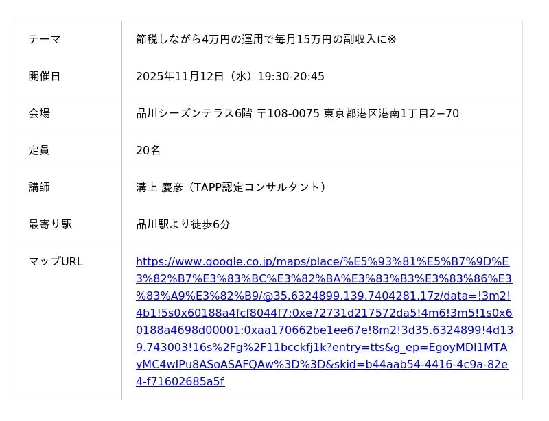 累計参加申込者数16万人を突破した資産運用セミナー「キャピタルハックセミナー」を運営する株式会社TAPP(本社:東京都港区、代表取締役:山地 学、以下:TAPP)は、11/12(水) 19:30より、品川本社で完全予約制の無料オフラインセミナーを開催いたします。当セミナーはセミナー開始の30分前まで申し込みを受け付けております。先着順とさせていただき、満席になり次第参加の募集を終了させていただきます。