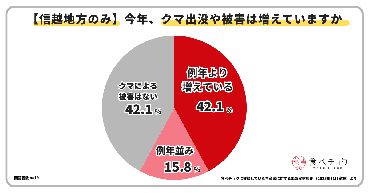アンケートに回答した生産者のうち信越地方の生産者に絞ると、2025年にクマの出没や被害が「例年より増えている」と回答した生産者は42.1%。「例年並み」15.8%を合わせると、57.9%がクマの出没や被害を実感していることが分かりました。