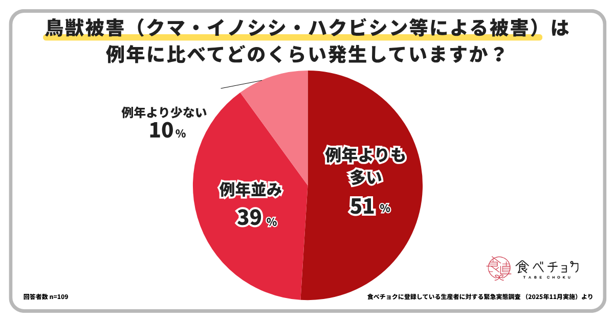 今年鳥獣被害が発生していると回答した生産者のうち、51%が「2025年に鳥獣被害が例年よりも多い」と回答。一方で、「例年並み」は39%、「例年より少ない」は10%となりました。