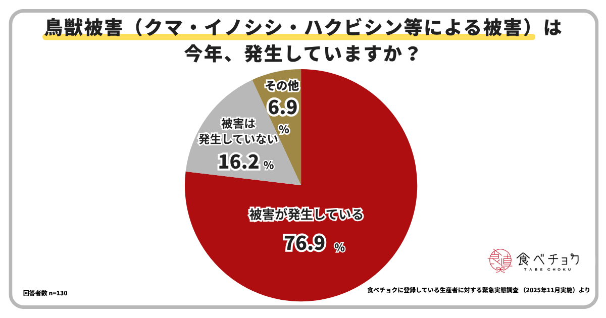 「2025年に鳥獣被害が発生している」と回答した生産者は、76.9%に上りました。