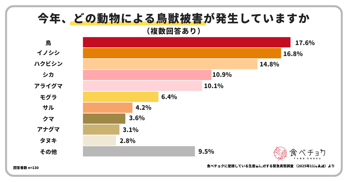 被害をもたらす主な野生動物は、鳥(17.6%)、イノシシ(16.8%)、ハクビシン(14.8%)、シカ(10.9%)、アライグマ(10.1%)、モグラ(6.4%)、サル(4.2%)、クマ(3.6%)、アナグマ(3.1%)、タヌキ(2.8%)。その他も含めると計20種類にのぼり、多様な害獣による被害が発生していることが明らかになりました。