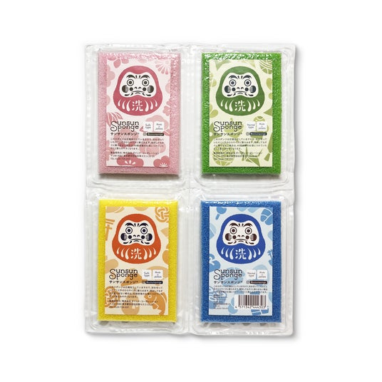 また同時に、幸運や願掛けの象徴として親しまれる「だるま」をモチーフにした〈だるまサンサンスポンジ〉も発売いたします。ピンク(恋愛・良縁)、緑(健康・癒し)、黄(金運・幸運)、青(立身出世)と、それぞれに異なる願いを込めた4色展開で、新たな目標に挑む方へのギフトとしてもおすすめです。