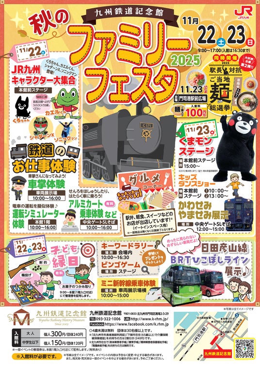 JR九州では、九州鉄道記念館(福岡県北九州市門司区)を会場に、2025 年 11 月 22 日(土)・ 23 日(日・祝)の 2 日間「秋のファミリーフェスタ 2025」を開催いたします。