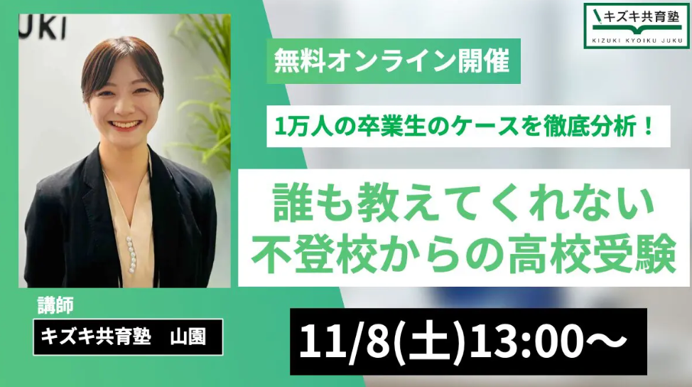 1万人の不登校生をサポートしてきたキズキ共育塾が、「不登校からの高校受験」を成功へ導くためのノウハウを徹底解説します!