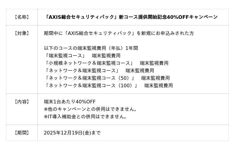株式会社アクシス(東京都中野区、代表取締役 宮腰 行生、以下「アクシス」)は、ランサムウェアに強いサイバーセキュリティソリューション「AXIS総合セキュリティパック」の従来の3コースに加え、新たに2コースの提供を開始しました。これを記念して端末監視費用40%OFFキャンペーンを実施します。
