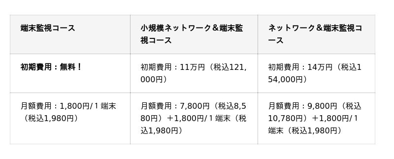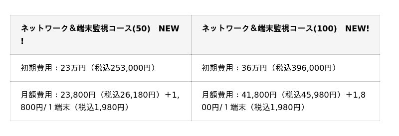 「ネットワーク&端末監視コース(50)」は、端末50台までの規模、「ネットワーク&端末監視コース(100)」は端末100台までの規模でご利用いただけます。従来のコースではカバーしきれなかった中規模オフィスや大規模拠点のお客様向けとして提供を開始し、様々な規模の拠点に導入できるようになりました。