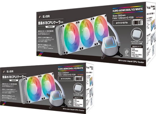 PCパーツブランド「玄人志向」は、簡易水冷CPUクーラー「KURO-AIOWC/V2シリーズ」に、新たにホワイトカラーモデル『KURO-AIOWC360L/V2/WHITE』『KURO-AIOWC240L/V2/WHITE』を発売いたします。