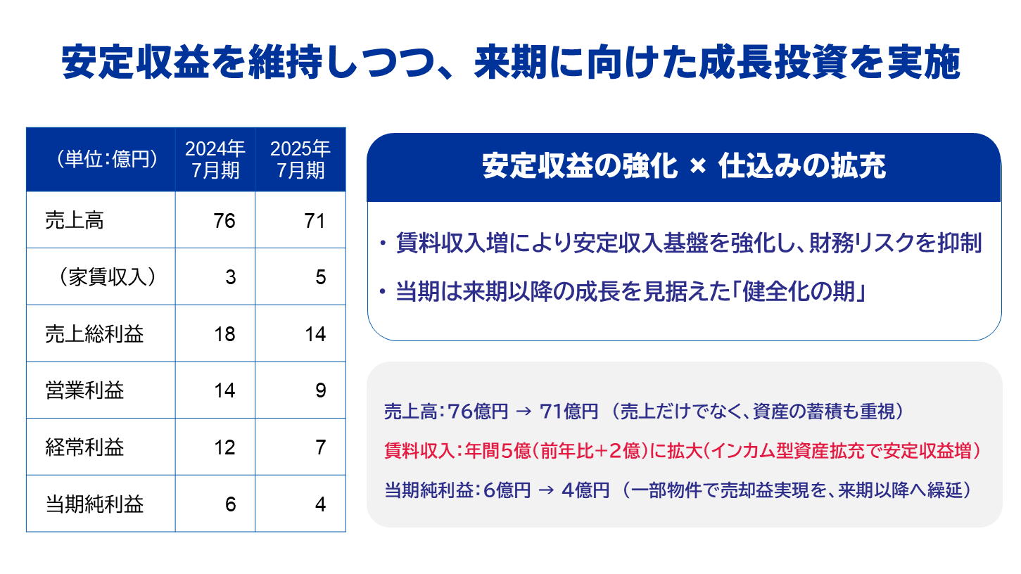 ・ 賃料収入 年間5億円(前年比+2億円) と、安定収益基盤をさらに強化