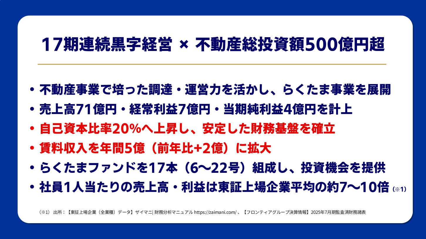 フロンティアグループは、今後も財務の健全性を堅持しながら、インカム型資産を中心に安定した収益基盤を拡大してまいります。また、『らくたま』を通じて、投資家の皆さまが“安心して長く続けられる資産運用”を実現できる環境づくりを一層推進していきます。これからも、確かな実績と新たな挑戦の両輪で、持続的な価値創出に取り組んでまいります。