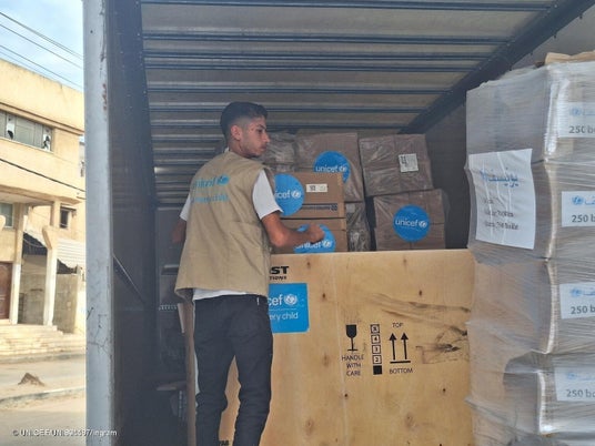 ガザ中部のデルバラハで、予防接種キャンペーンのための支援物資を荷下ろしするユニセフのスタッフ(パレスチナ、2025年11月4日撮影) (C) UNICEF/UNI894487/Ingram