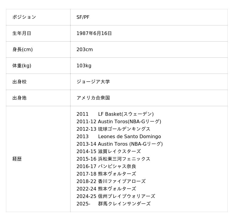 群馬クレインサンダーズファミリーに加わり、この素晴らしい組織とコミュニティを代表してプレーできることを本当に光栄に思います。バスケットボールは私に多くのものを与えてくれました。今シーズン、チームが新たな高みに到達できるよう、自分のすべてを捧げたいと思います。素晴らしいファンの皆さん、皆さんのエネルギーとサポートが私たちの力になります。一緒に特別な時間を作り上げ、心に残るシーズンにしましょう。