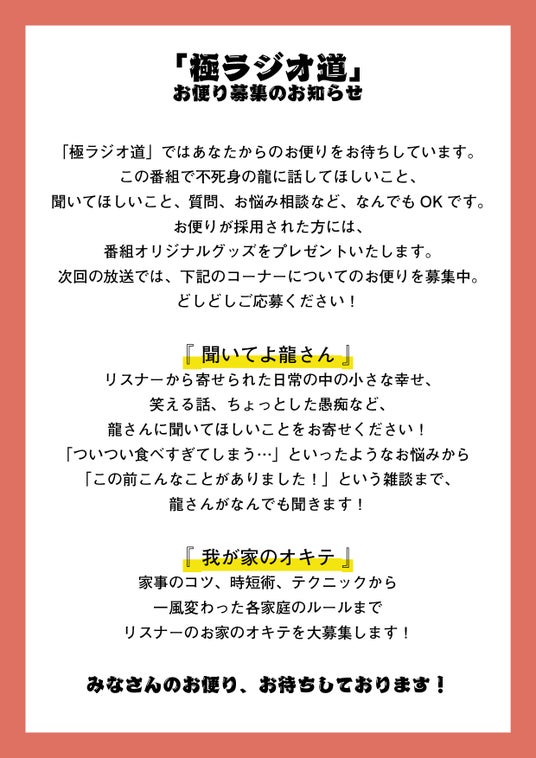 番組放送に先がけて、リスナーの皆さまからのお便りを募集いたします。