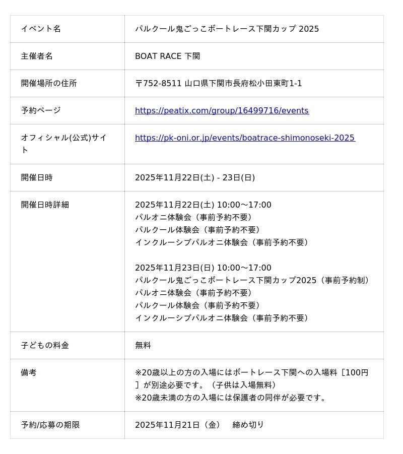 BOAT RACE 下関で開催される「パルクール鬼ごっこボートレース下関カップ2025 」では、「あそびがカラダを作る!」をテーマに、パルクール鬼ごっこで楽しさとともに能力を向上させる、小学生以下及びその保護者を対象とした限定のイベントを11月22日(土)・23日(日)で2日間に渡り開催!