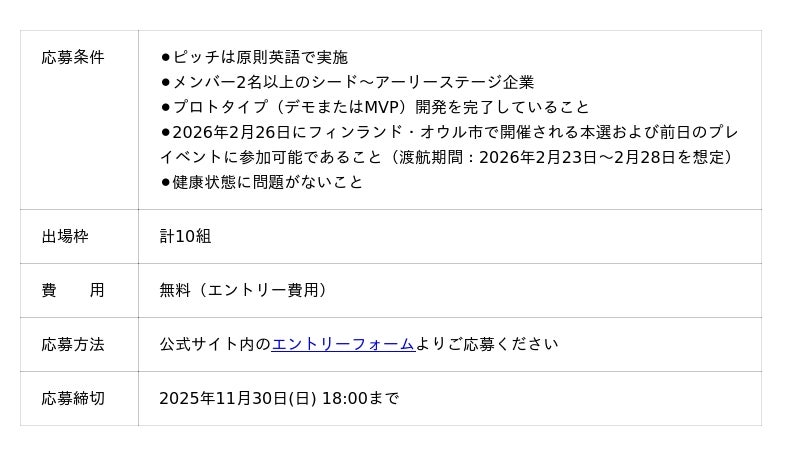 近年、フィンランド国内においてスタートアップが活発な背景には、優れた独自のエコシステム(スタートアップ企業の成長を組織的に支援する枠組み)の発達があると評されており、北フィンランドに位置するオウル市もそのひとつ。国内でも5番目に大きな都市であるオウル市は、人口1/3以上が学位取得者という“教育の町”としても知られ、教育と技術によって持続可能な発展を遂げてきました。本大会は、2014年に始まったフィンランド・オウル市発の世界的スタートアップイベント「Polar Bear Pitching」の公式サテライトイベントの日本予選として実施されるもので、オウル市の行政機関である「BusinessOulu」後援のもと、今年2025年1月開催した第1回大会に続き、第2回「PBP TOKYO」を開催することとなりました。優勝者には2026年2月26日(木)にフィンランド・オウル市で開催される本選への出場権と、渡航費、宿泊費が授与されます。