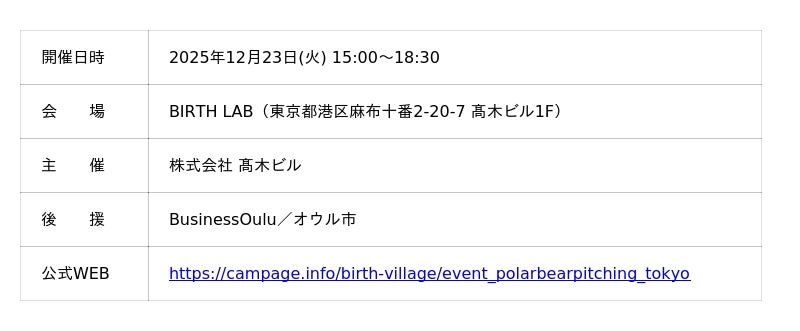 オフィスビル・レジデンス・コワーキングスペース等を都内に展開し、不動産の新しい価値を生む“場所”“まち”づくりにつながる企画・運営を行う株式会社高木ビル(本社:東京都港区西新橋 代表取締役:高木秀邦 ※「高」は「はしごだか」が正式表記)は、フィンランド・オウル市で生まれたユニークなスタートアップピッチング大会の日本予選「Polar Bear Pitching TOKYO」(以下、PBP TOKYO)を、2025年12月23日(火)に当社が運営するコミュニケーションスペース「BIRTH LAB」(東京都港区麻布十番)にて開催いたします。