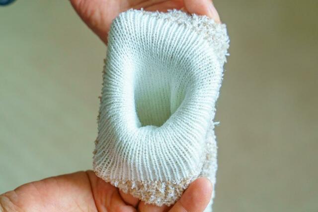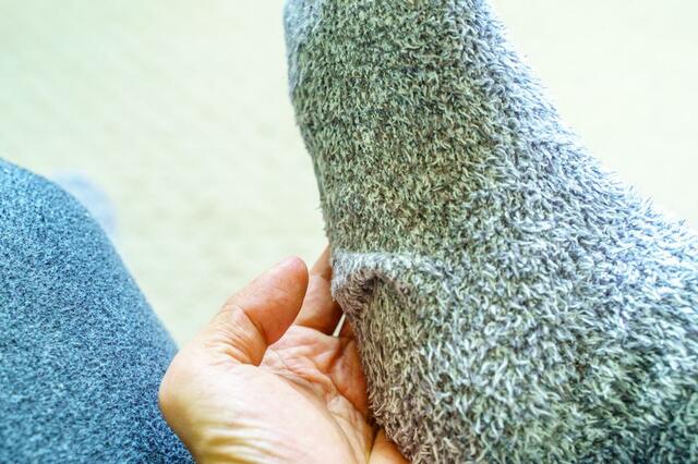 「ぽかぽかカイロソックス」は外側と内側で2つの素材を使った二重構造が暖かさに繋がってるわけなんですが、その特性上どうしても外と内の生地がズレがちになります。
