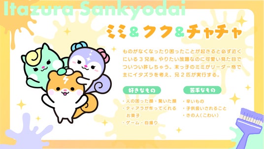 ものがなくなったり困ったことが起きると必ず近くにいる3兄弟。やりたい放題なのに可愛い見た目でついつい許しちゃう。末っ子のミミがリーダー格で主にイタズラを考え、兄2匹が実行する。
