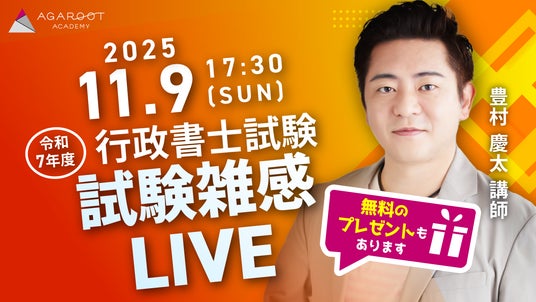 株式会社アガルート(本社:東京都新宿区、代表取締役:岩崎 北斗)が運営する「アガルートアカデミー」は、行政書士試験当日の11月9日(日)に、「解答速報」、YouTubeLIVEによる「試験雑感」「総評」「トークライブ」の配信を無料で実施いたします。