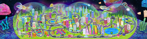 巨大なスクリーンの中には色とりどりの家や車、UFOなどが飛び交い、とってもにぎやか。実はコレ、訪れた人の手で作り上げられた街なんです!